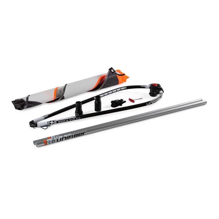 L’ensemble est livré complet avec une voile, un mât en aluminium, un wishbone en aluminium, une rallonge, un tire-veille, un jeu de bouts et un sac.
